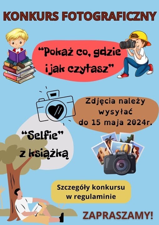 W ramach Tygodnia Bibliotek zapraszamy po raz kolejny wszystkich chętnych do udziału w konkursie fotograficznym "Pokaż, co, gdzie i jak czytasz..."