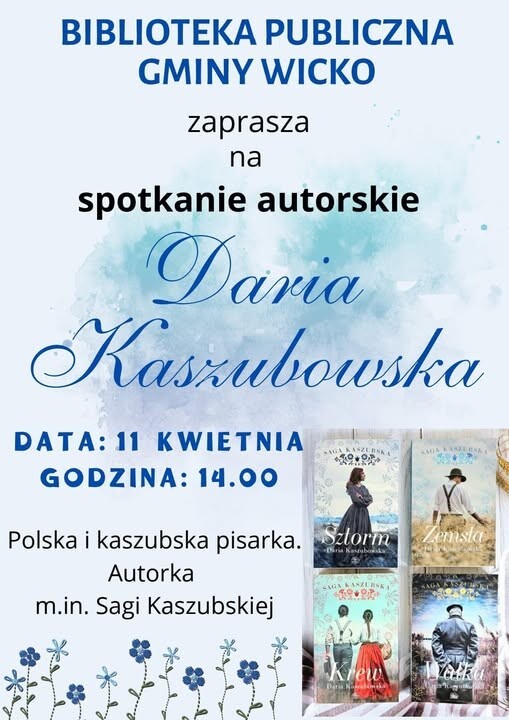 Serdecznie zapraszamy na spotkanie autorskie z Darią Kaszubowską - 11 kwietnia, godz. 14.00 w Bibliotece Publicznej Gminy Wicko.